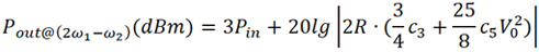 (2) 当输入信号功率比较低时,c3V02→0,c5V02→0,c5V04→0,此时基频信号和三阶交调失真的输出功率随输入功率呈现为近似线性关系。这一点比较重要,因为在后面推导三阶交调点(IP3) 功率时需要基于这一近似线性关系;