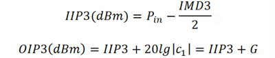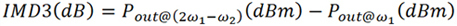 三阶交调分量与基频分量的功率比值定义为IMD3,使用对数表示为