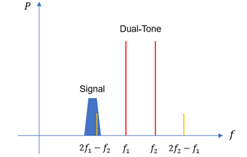 当给放大器输入单音信号(即单频点信号) 时,放大器将输出基频及其谐波分量。当输入双音或多音信号时,放大器的非线性将导致不同频率之间进行组合而产生不同的频率成分,这些称为交调失真产物。