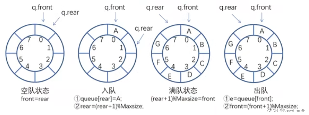 入队:①queue[rear]=A;②rear=(rear+1)%Maxsize;