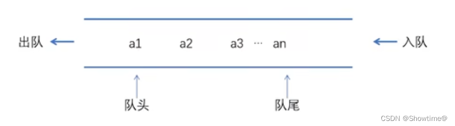 向队列中插入元素称为入队,从队列中删除元素称为出队。