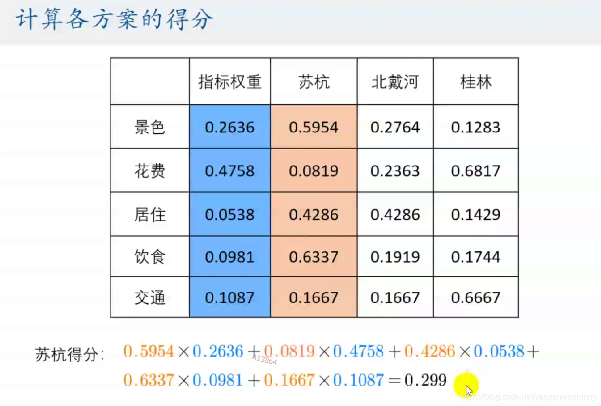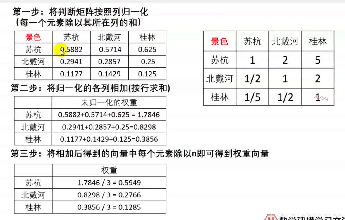 也可以按照第二列或者第三列的数据进行计算。权重计算完后需要归一化处理。