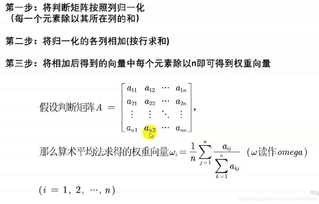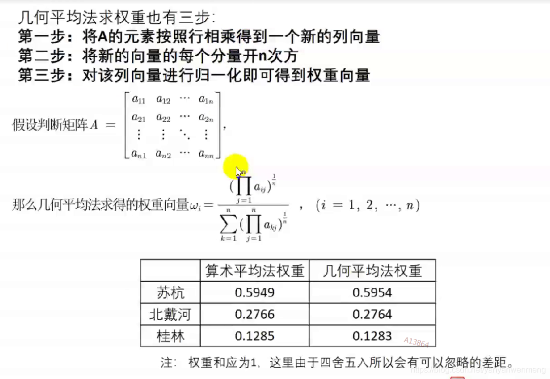 由于判断矩阵不一定为一致矩阵,所以它的各行(列)之间不一定成比例,因此,计算权重时需要利用每一列的数据把权重计算出来,最后利用三种方法求权重即可。