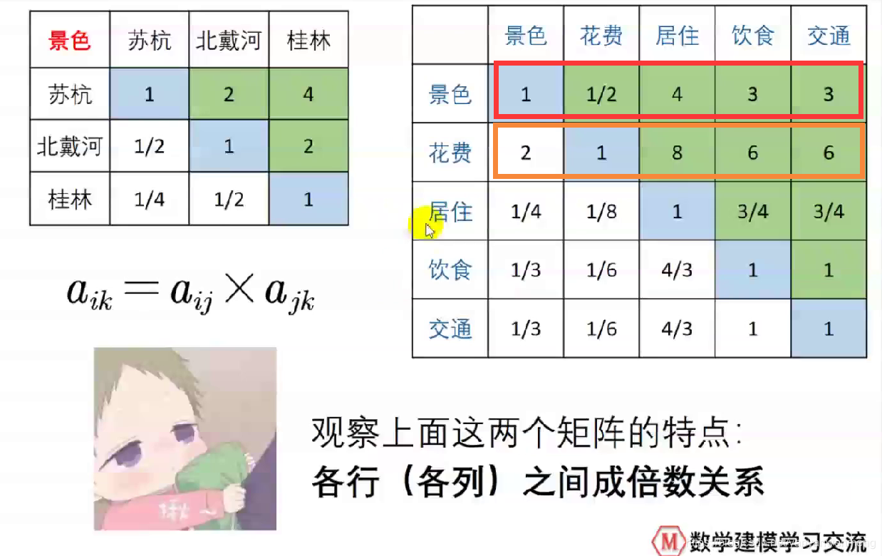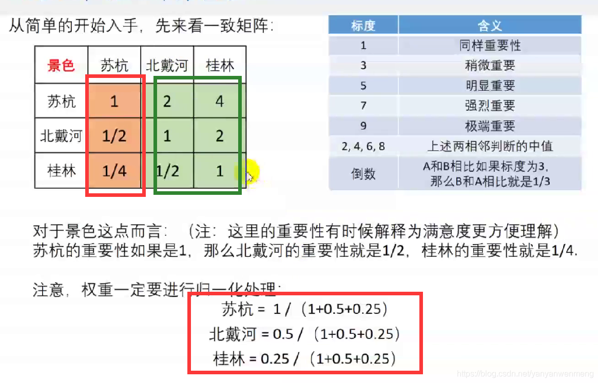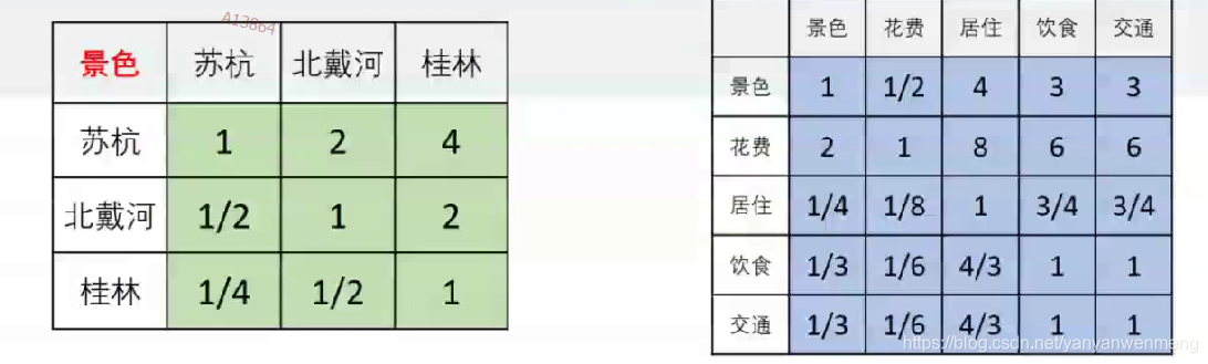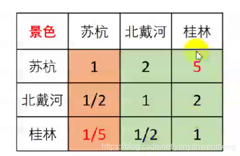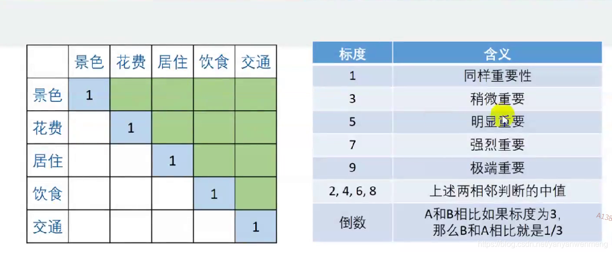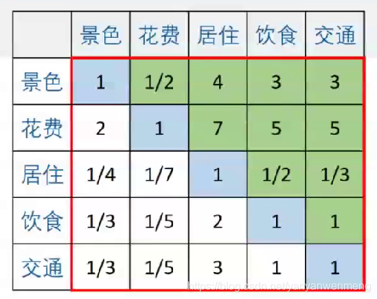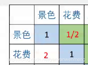 比如:如果花费比景色略微重要,则左下角单位格可以填2。