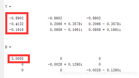 最大特征值为3.0055,对应的特征向量为[-0.8902 -0.4132 -0.1918]