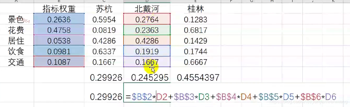 excel中进行计算每个城市的得分(需要用“$”符号锁定单元格):