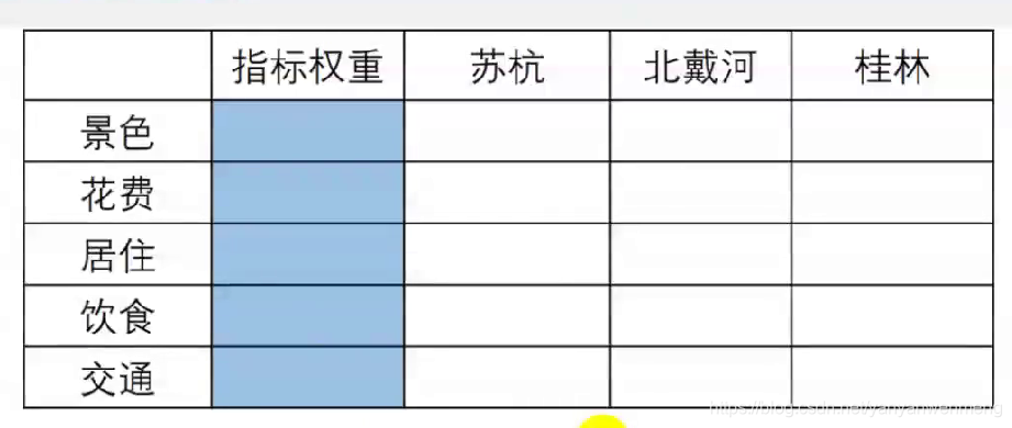 比如要确定景色、花费等五个指标的权重,该如何确定呢?