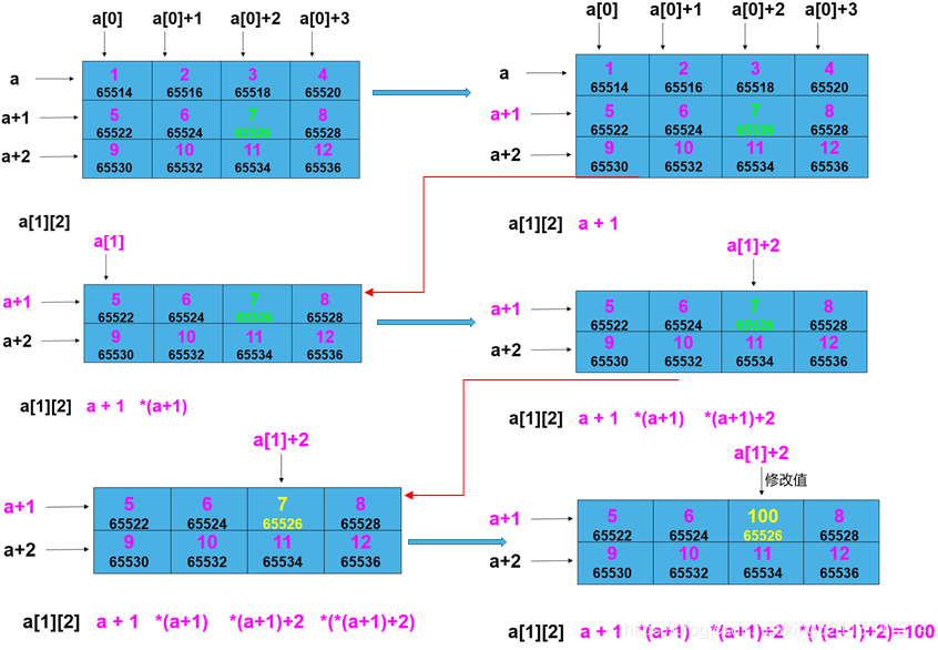 a [0]+1(第0行第1个元素的地址)指向a [0] [1],有*(a [0] +1)= a [0] [1];