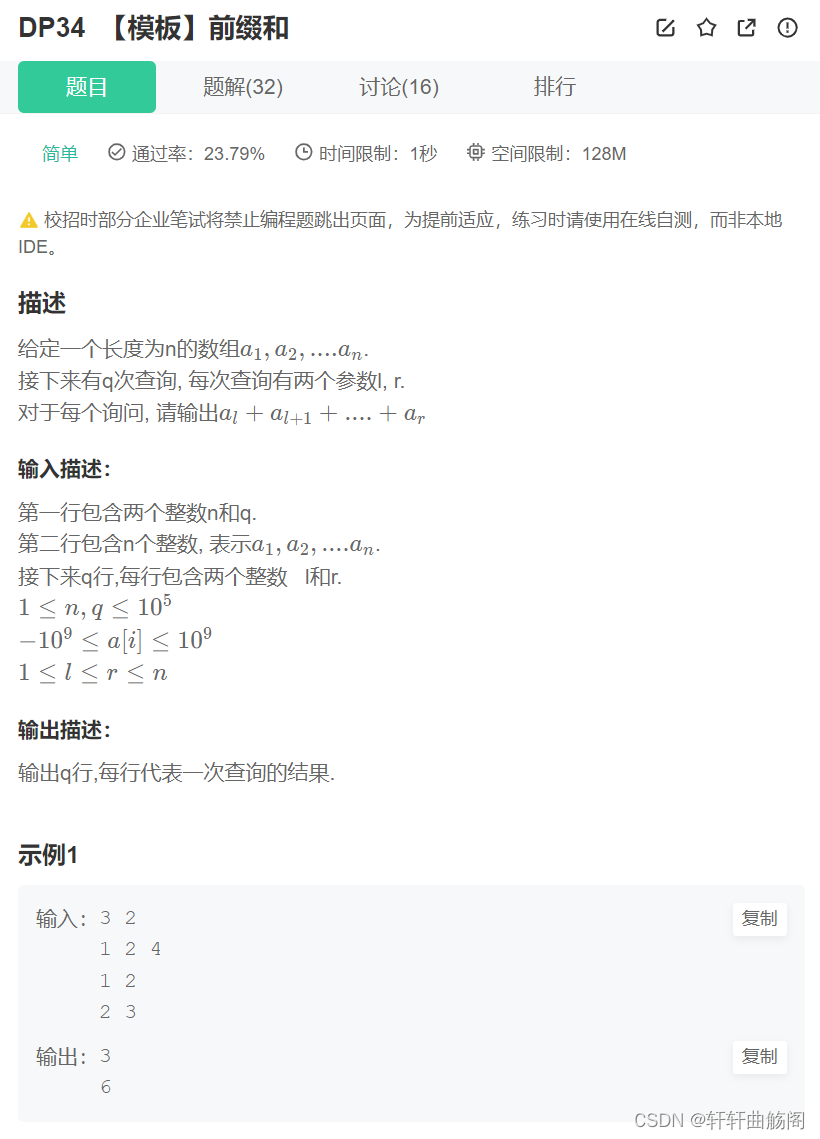 在这里我们通过一个例题来讲解:【模板】前缀和_牛客题霸_牛客网 (nowcoder.com)
