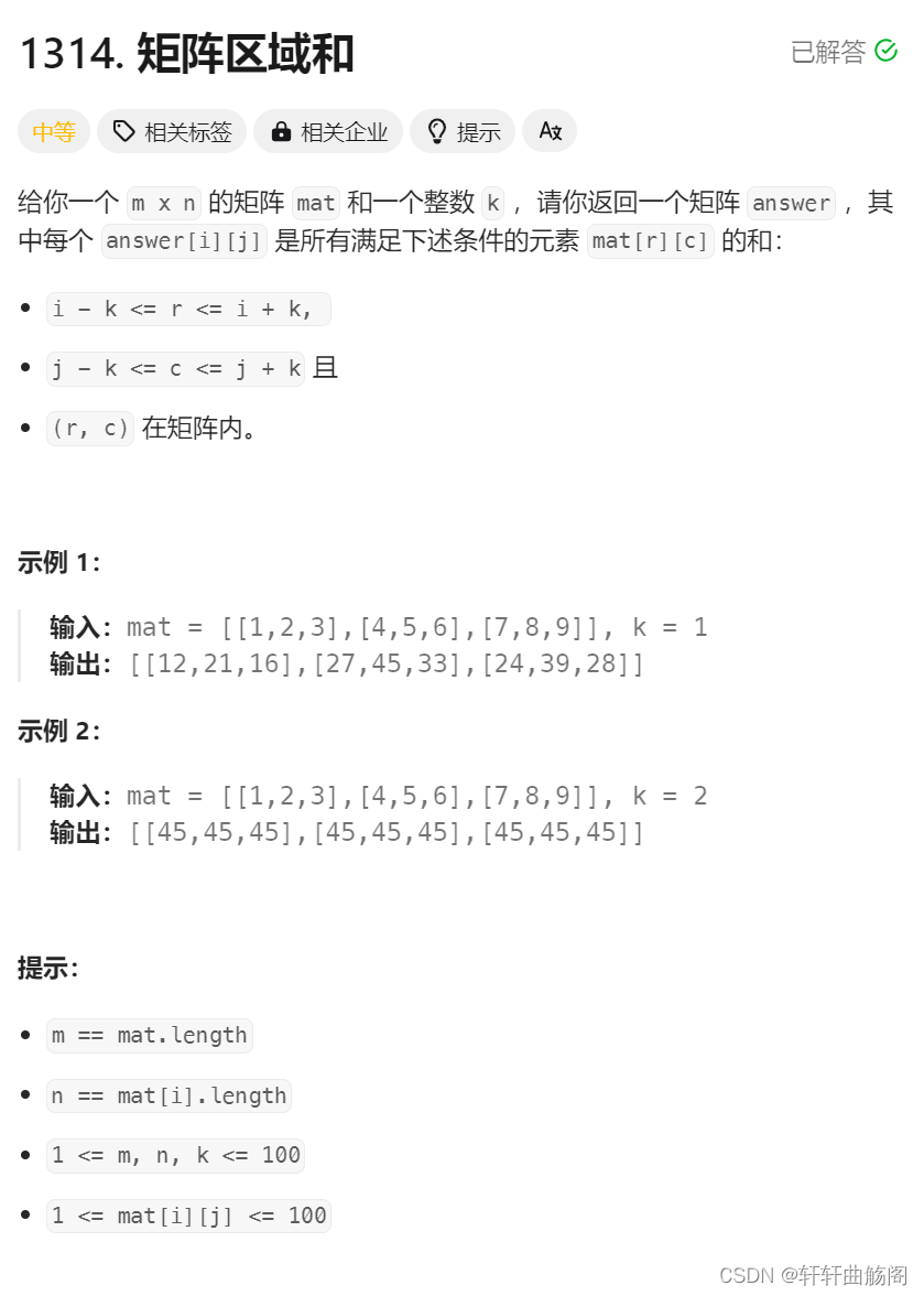 题目链接:1314. 矩阵区域和 - 力扣(LeetCode)