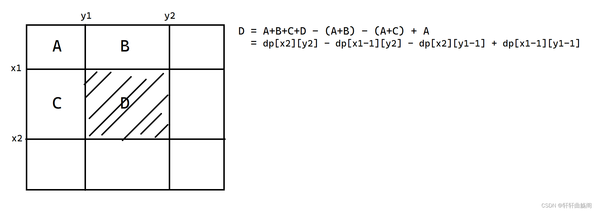 ret[i][j] = dp[x2+1][y2+1] - dp[x1][y2+1] - dp[x2+1][y1] + dp[x1][y1];