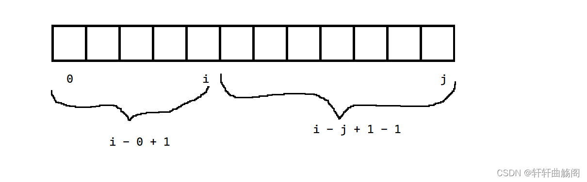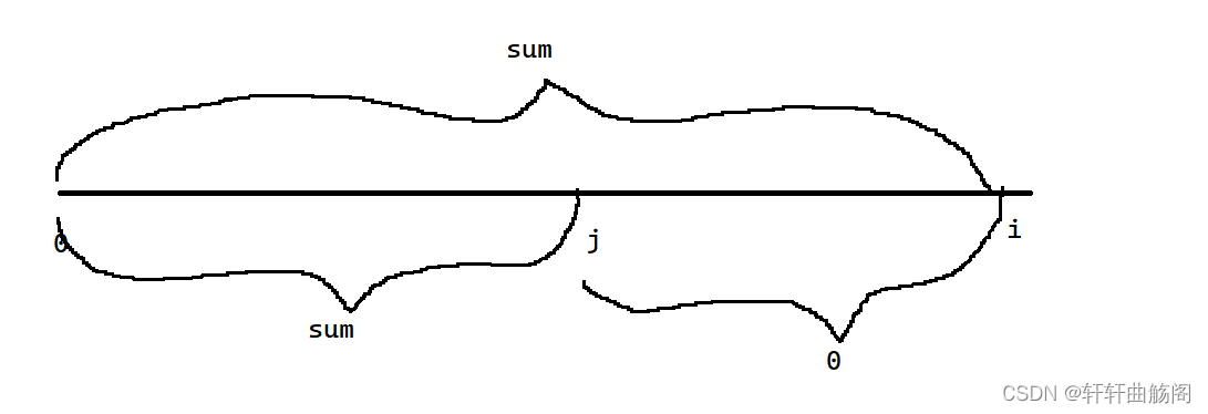 我们要想知道区间长度,就需要知道i和j,因此我们向哈希表中存入的value为当前前缀和的下标。此外,如果我们再次遇到一个值为sum的下标,由于这里求得是最长区间,所以我们不需要更新hash[sum]。而如果整个区间的长度都为0,那么我们就需要在前缀和为0的情况下,找到一个下标为-1的地方来统计整个数组长度。此外,我们计算长度时,图解如下
