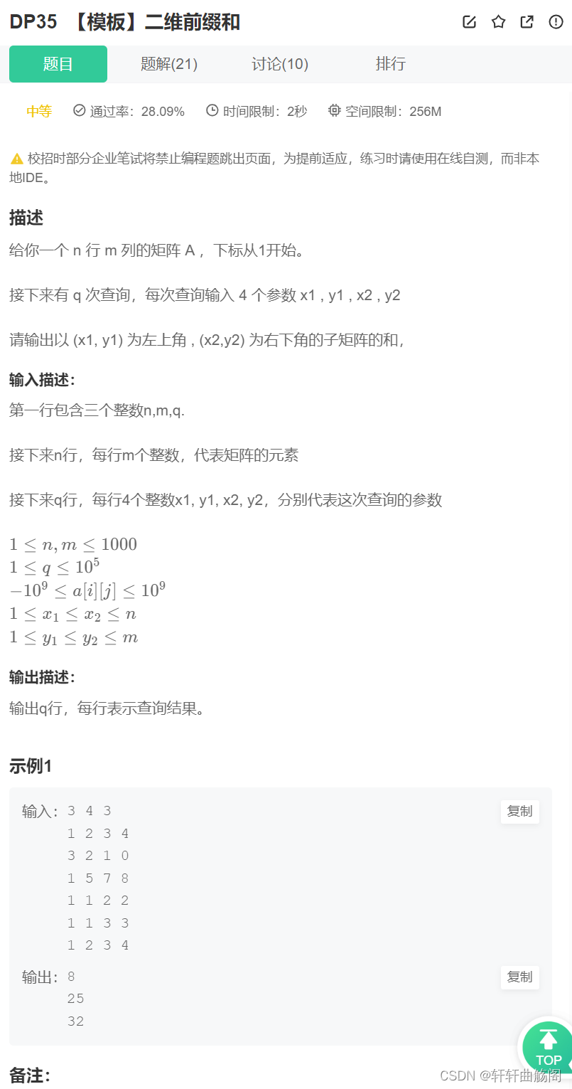 在这里我们使用另一个例题:【模板】二维前缀和_牛客题霸_牛客网 (nowcoder.com)