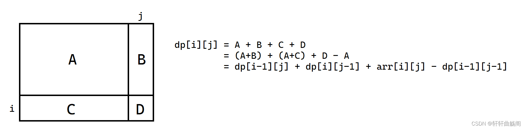 即dp[i][j] = dp[i-1][j] + dp[i][j-1] + arr[i][j] - dp[i-1][j-1],在预备好了dp数组过后,我们如何来使用它呢?图解如下