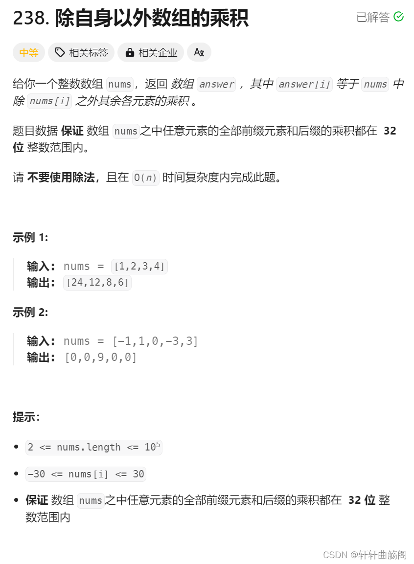 题目链接:238. 除自身以外数组的乘积 - 力扣(LeetCode)