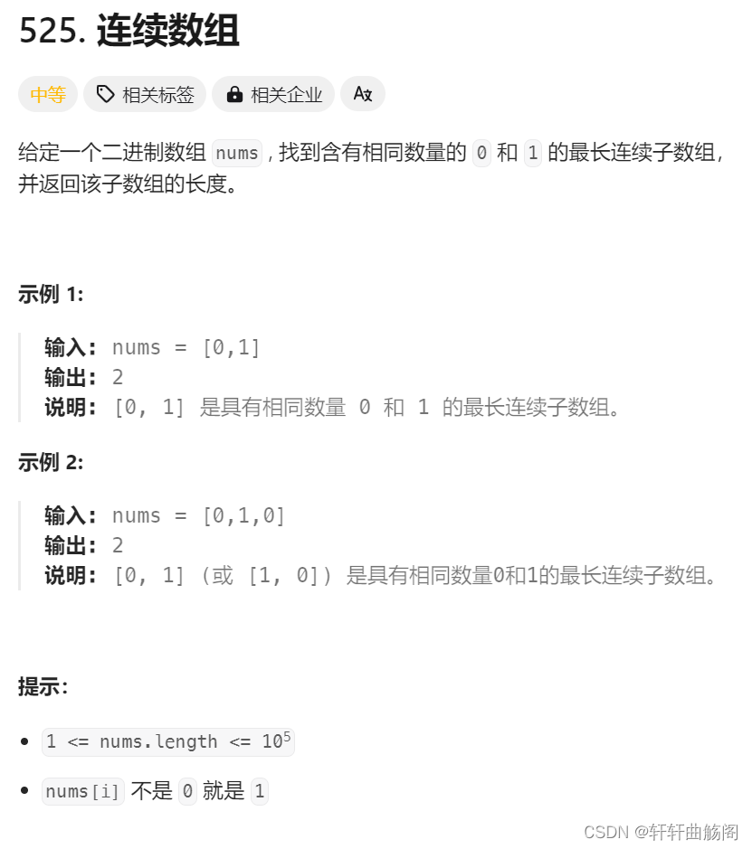 解析:对于这道题我们直接解决还是有点困难,可以先将0转换成-1,这样就与我们之前做的和为k的子数组相似了,我们还是可以定义dp[i]是以i位置为结尾的所有子数组,要想找到和为0的子数组只需要找到sum相同的区间,并计算这个区间的长度,图示如下