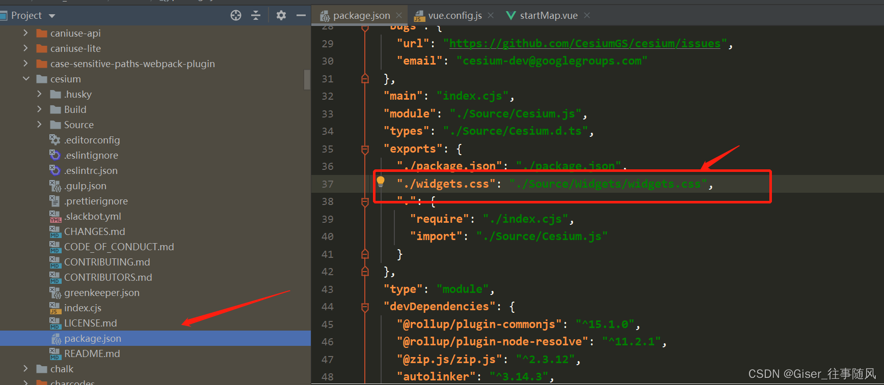1.node_modules里找到cesium的package.json文件,在exports里增加导出widgets.css
