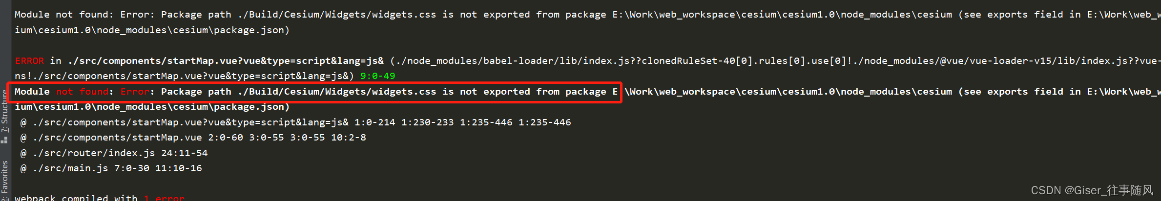 一、解决cesium widgets.css is not exported from package在版本1.9以上版本后,按照官方文档引入css 时会报错:cesium widgets.css is not exported from package解决方案:1.node_modules里找到cesium的package.json文件,在exports里增加导出widgets.css"./wi