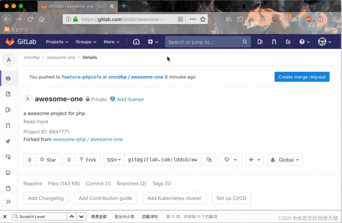 小L很开心,因为发现他名下的 awesome-one 仓库 中已经多了一个远程分支 feature-phpinfo。接下来小L要把这个已经开发好的功能分支合并到主仓中以便后续进行功能测试以及产品验收等步骤。首先小L创建了一个 MR (因为本地分支是推送到了小L从主仓中 Fork 出来的个人仓库中,所以创建 MR 的动作也应该在自己仓库的 GitLab Web 页面中进行):