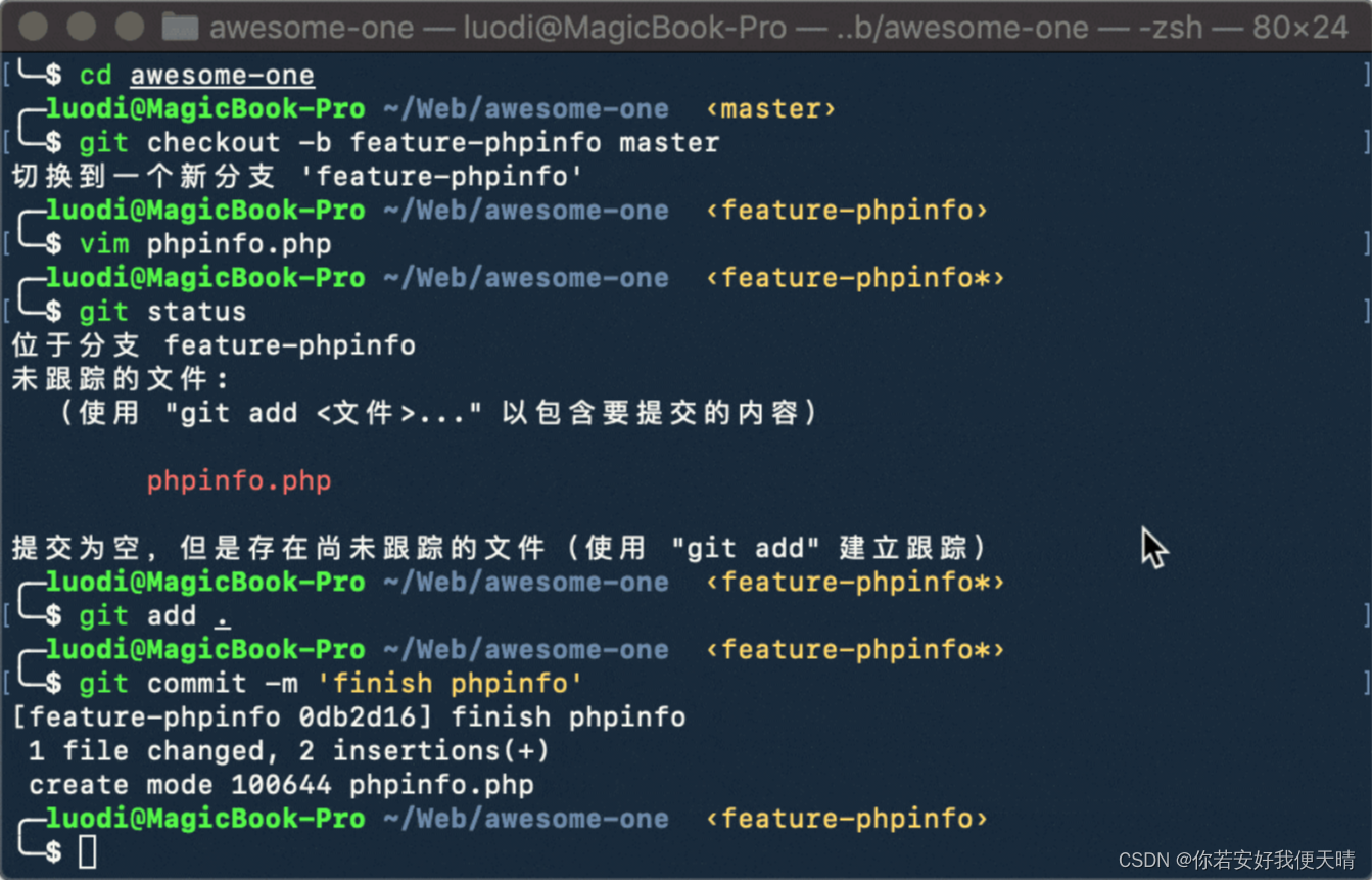 完成本地提交之后,接下来要进行远程分支的提交,小L提交到了自己名下的仓库中(也就是zmcdbp/aweosme-one),分支名称与本地分支保持同步,方便日后翻阅查找(此处因为小L名下的 awesome-one 仓库中尚未存在 feature-phpinfo 分支,所以在 push 操作的时候需要带上 -u 参数告诉 GitLab 需要创建一个名叫 feature-phpinfo 的远程分支):