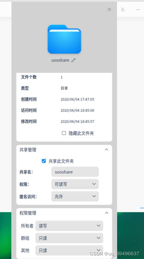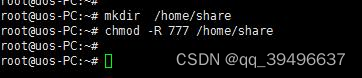 SMB(Server Messages Block,信息服务块)是一种在局域网上共享文件和打印机的一种通信协议,它为局域网内的不同计算机之间提供文件及打印机等资源的共享服务。smb(Server Messages Block,信息服务块)是一种在局域网上共享文件和打印机的一种通信协议,它为局域网内的不同操作系统的计算机之间提供文件及打印机等资源的共享服务。UOS 文件默认权限是其他用户只读,如果想