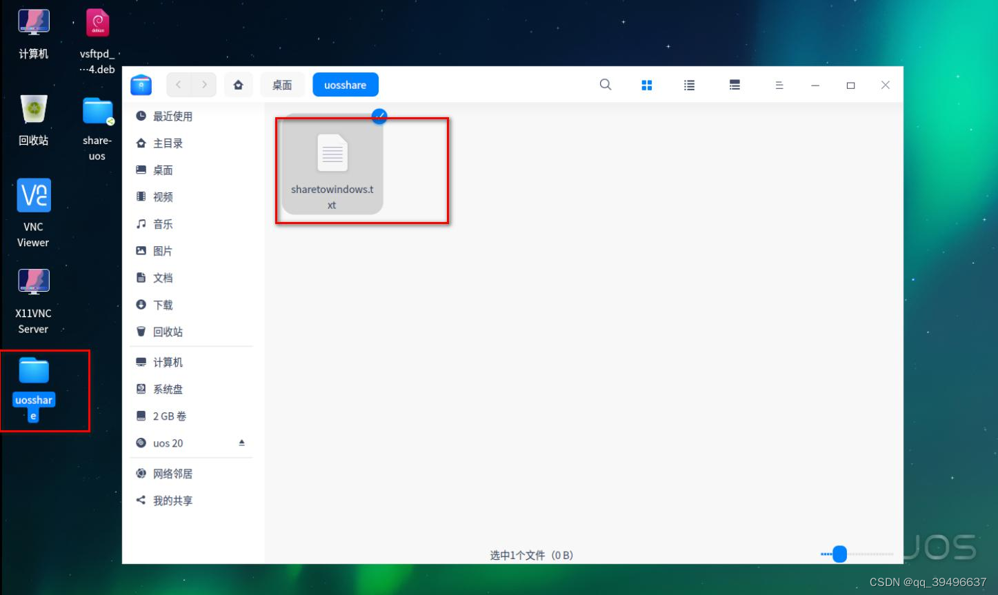 首先在 UOS 的桌面建立一个文件夹,uosshare,并且在文件夹中随便建一个文件。