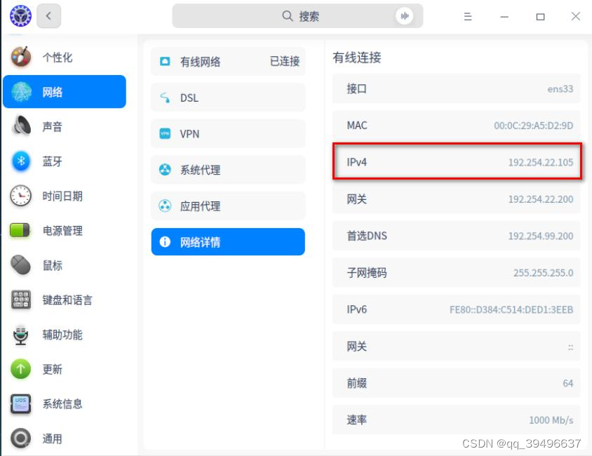 在控制中心网络选项中找到网络详情,可查看 UOS IP 信息,也可以直接把光标移到右下角的网络连接图标,查看 IP 信息。
