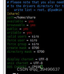 valid users = siro #设定只有此名单内的用户才能访问共享资源(拒绝优先)(用户名/@组名