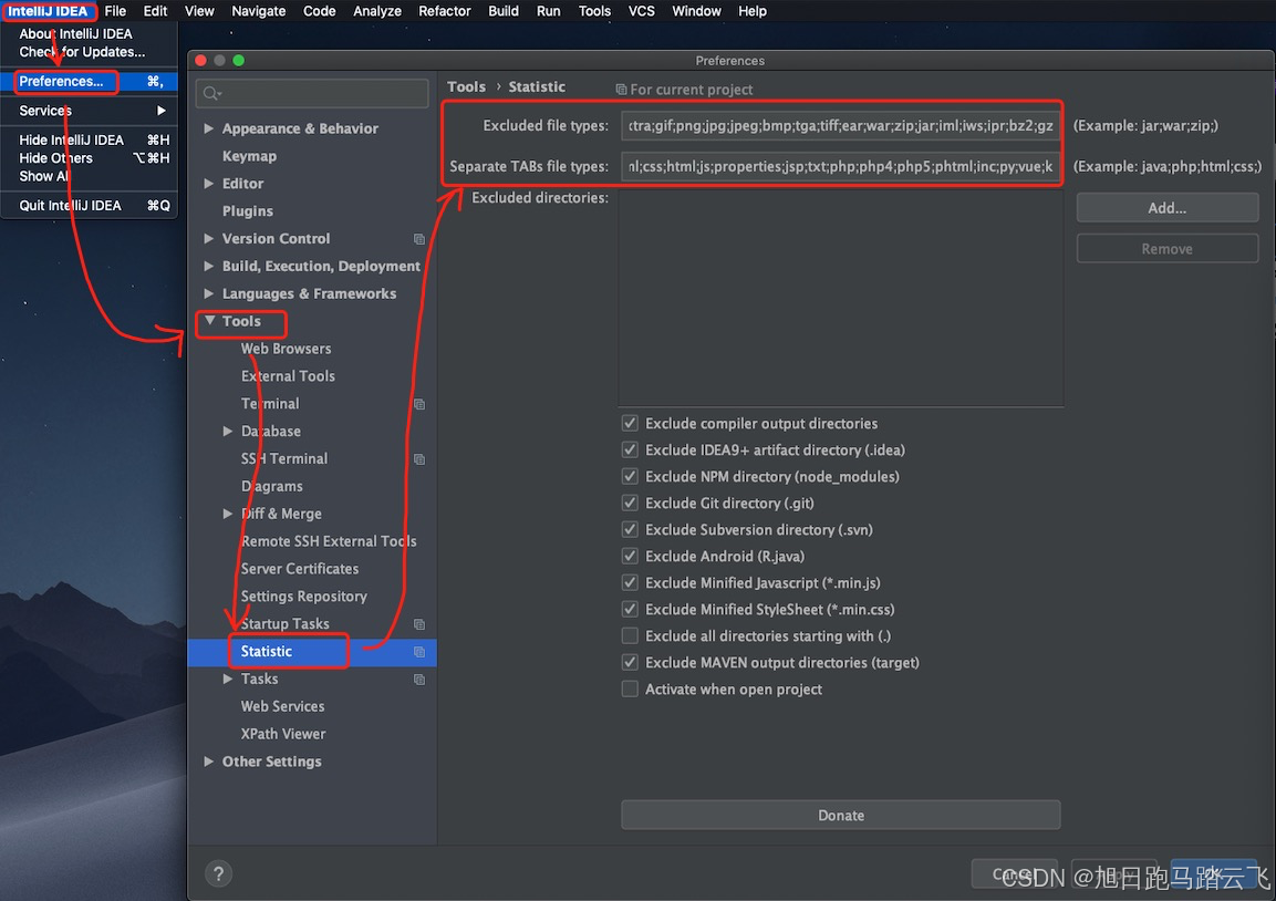 在 Preferences --> Statistic 中进行设置,可以根据实际情况,对指定文件类型的文件进行统计: