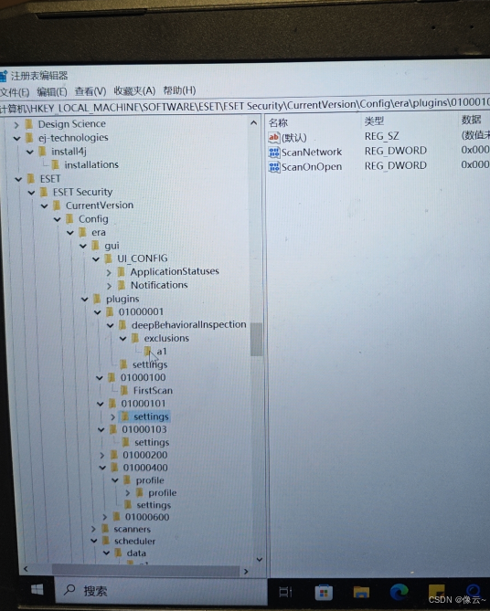 进入安全模式后,左下角搜索注册表,打开注册表,没找他所说的那个目录,和ESET相关的只有如下目录,这么多注册变量,根本不知道改哪个,于是乎,浅试一下直接放弃。