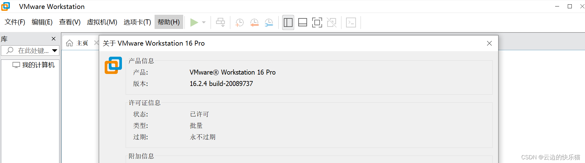 进入VMware界面里面,点击帮助-关于就可以看到激活状态了
