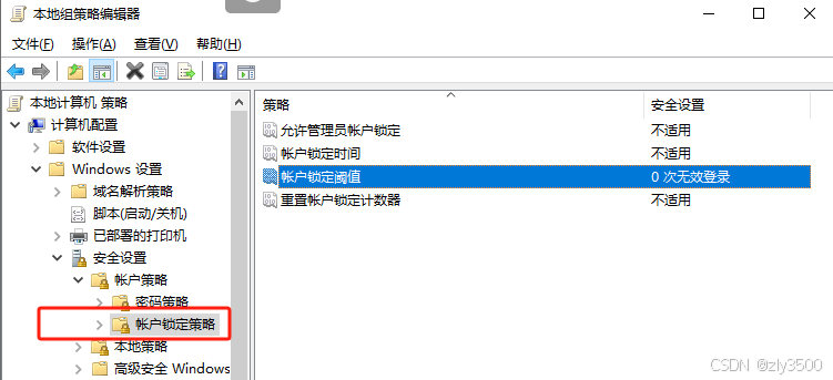 2)打开”本地策略“【计算机配置】-【Windows设置】-【账号锁定策略】-"账号锁定阈值",修改