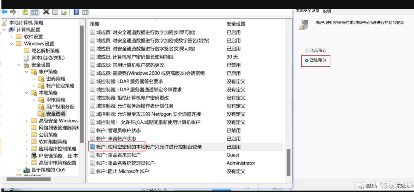 3) 【本地策略】-【安全策略】-【账户:使用空密码的本地账户只允许通过控制台登录】改为"禁止"