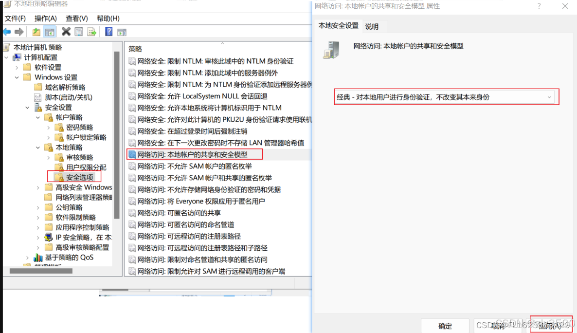 4) 【本地策略】-【安全策略】-【网络访问:本地账户的共享和安全模型】设为"经典-对本地用户进行身份验证,不改变其本来身份"