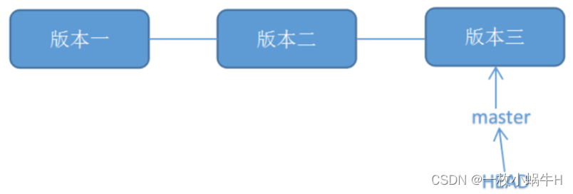 使用git的每次提交,Git都会自动把它们串成一条时间线,这条时间线就是一个分支。如果没有新建分支,那么只有一条时间线,即只有一个分支,在Git里,这个分支叫主分支,即master分支。有一个HEAD指针指向当前分支(只有一个分支的情况下会指向master,而master是指向最新提交)。每个版本都会有自己的版本信息,如特有的版本号、版本名等。如下图,假设只有一个分支: