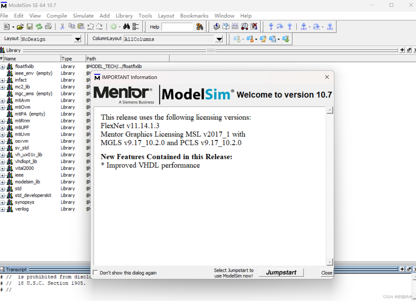 14、点击图标,打开modelsim后出现以下界面,则破解成功;
