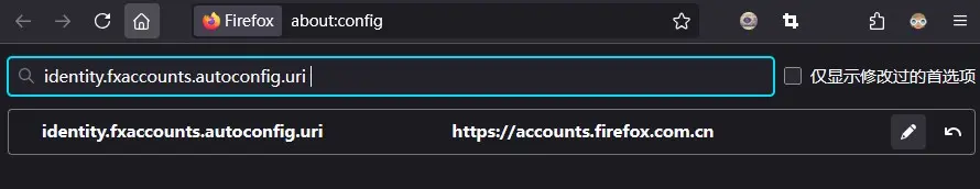 输入:identity.fxaccounts.autoconfig.uri – 后面出现的地方改为:https://accounts.firefox.com.cn/