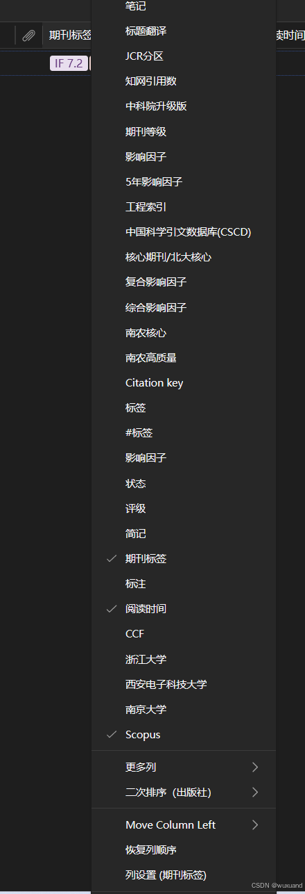 10、在软件正文界面,右键标题栏,勾选“期刊标签”,选择“列设置(期刊标签)”。
