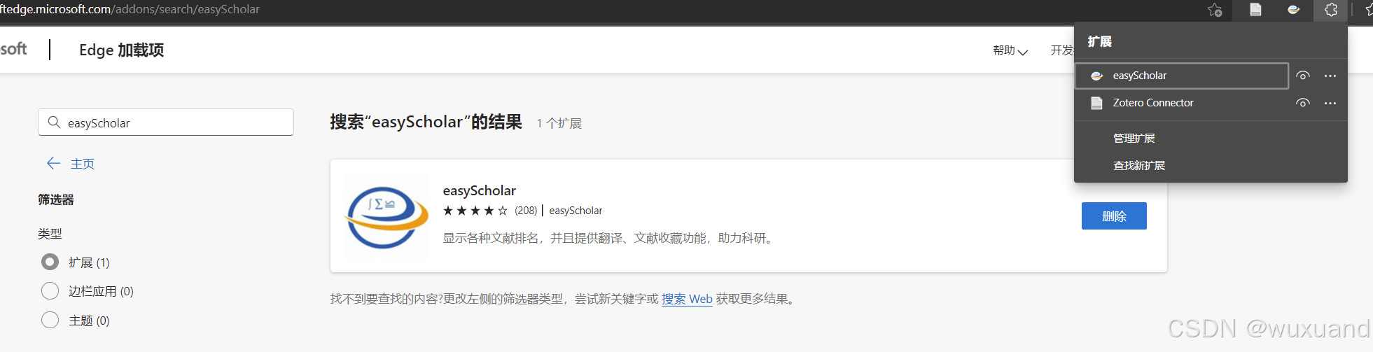 1、浏览器右上角选择,“管理扩展”,左侧搜索easyScholar。然后添加插件。
