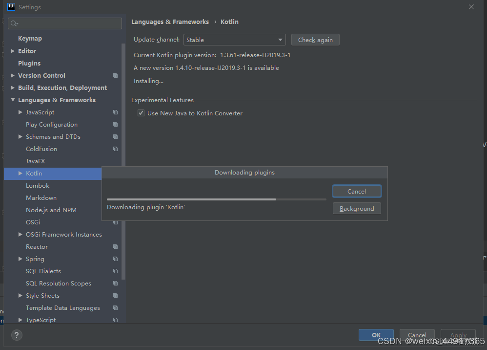 Windows系统:File -> settings -> Languages & Frameworks -> Kotlin。mac系统:Preferences -> Languages & Frameworks -> Kotlin。这个报错大概意思:模块是用不兼容的Kotlin版本编译的。原来是idea的kotlin插件版本比pom中的低。一种是升级下idea插件的版本。把项目里面的版本降一下。
