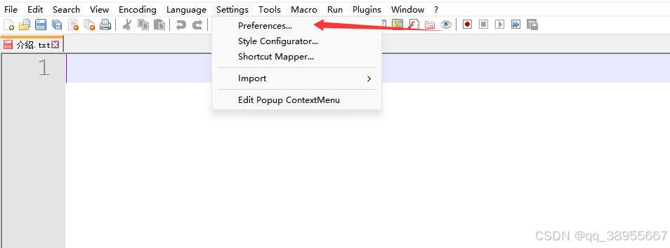 - 打开设置菜单:启动 Notepad++ 后,点击顶部菜单栏的 Settings(设置)。