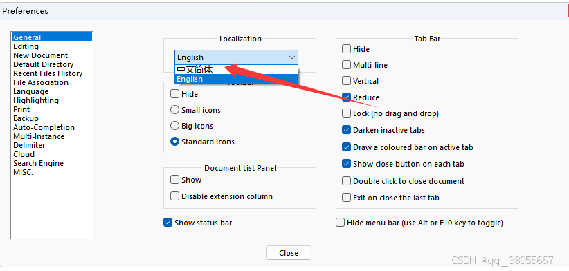 - 应用设置:选择完成后,点击窗口下方的 Close(关闭),Notepad++ 界面即可切换为中文显示。