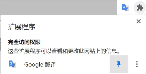 7. 点击Chrome浏览器工具栏上的“扩展程序”按钮“,再点击插件右边的小图钉,就能将它固定在工具栏上了。
