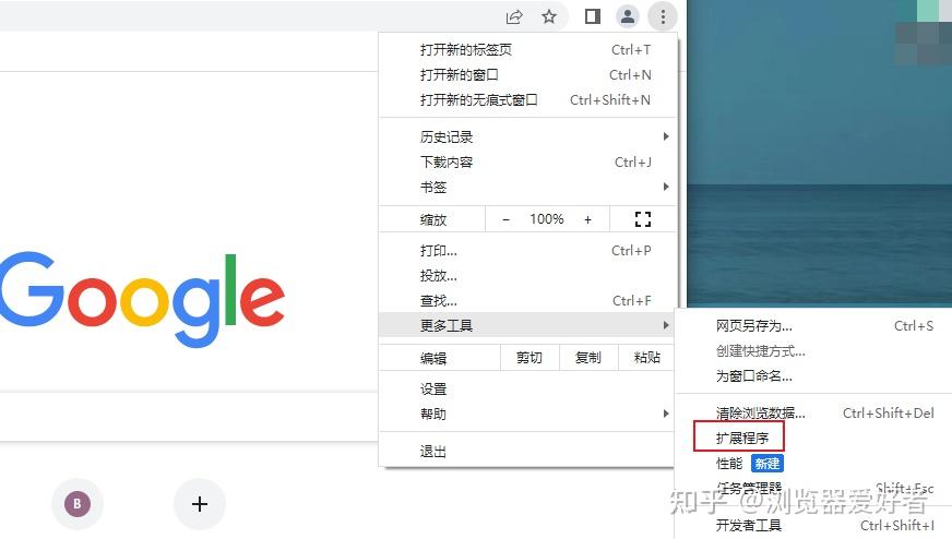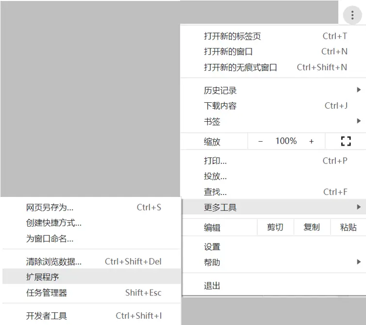 3. 点击Chrome浏览器右上角的三个点,并根据下图打开“扩展程序”管理页面。