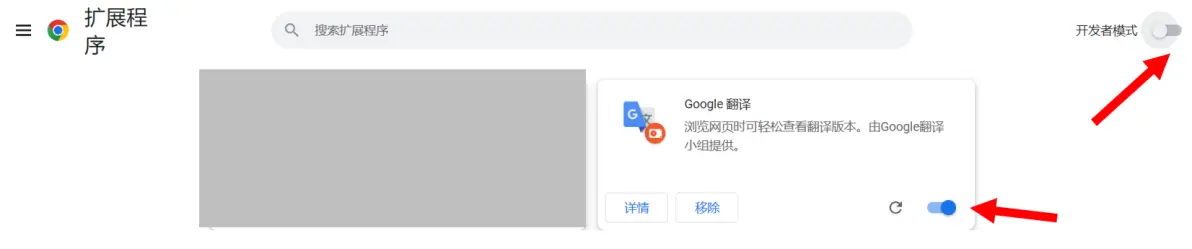 6. 最后把“开发者模式”关闭,再确保插件的开关是处于打开的状态。可忽略