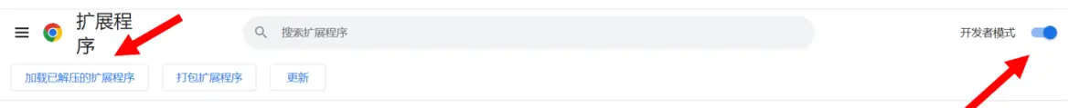 4. 首先打开页面中的“开发者模式”开关(在右上角),然后点击“加载已解压的扩展程序”按钮,打开文件浏览页面。