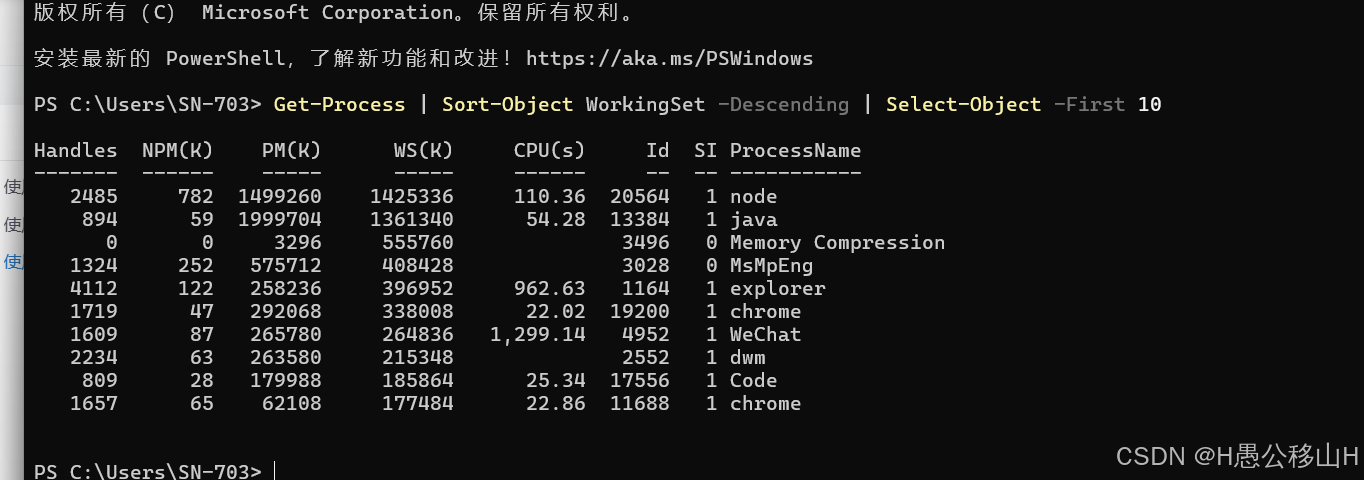 Get-Process | Sort-Object WorkingSet -Descending | Select-Object -First 10