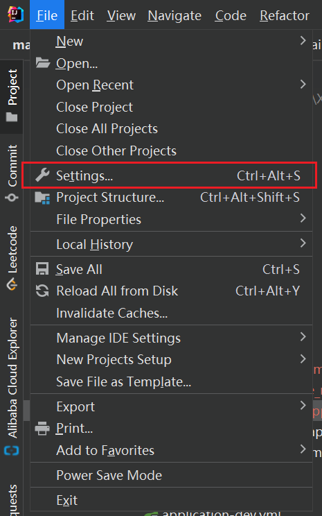 - 在菜单栏中 File -> Setting(快捷键 Ctrl+Alt+S)打开设置对话框。