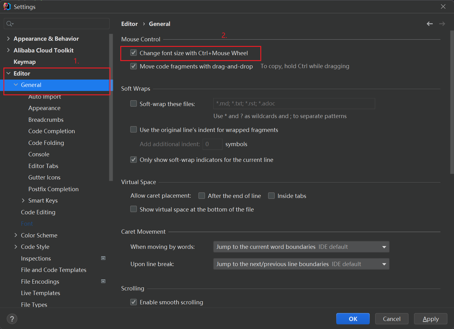 - 选择 Editor -> Font,勾选 Change font size with Ctrl+Mouse Wheel,即可。