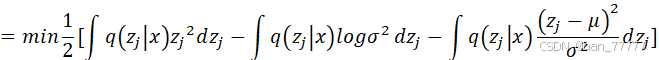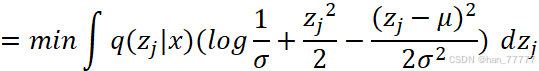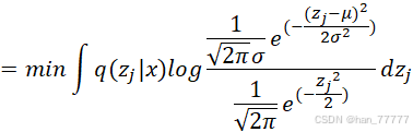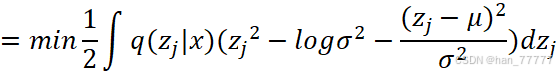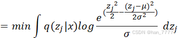 由前面的知识可知, q(z|x)是神经网络,它刻画的是一个高斯分布,p(z)是多维标准正态分布,他们的维度相同,同时各个维度间相互独立,因此只求一个维度,其余的完全相同,现在假设某一维为zj ,因此